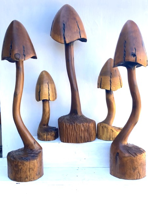 Vern’s mushrooms have spread, as mushrooms do! He carves them in different sizes, with individual variations that emerge from the features of the wood and his inclination of the day.